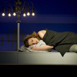 Laurent Laffargue accorde une attention toute particulière à ce cadre spatial, en lequel réside le principe de son adaptation. La chambre est en effet suspendue au-dessus de la scène, formée d’un parallélépipède qui tourne sur lui-même selon une machinerie que l’on imagine imposante. Rien ne subit la gravité des mouvements de cet espace, sinon la comédienne et son oreiller.