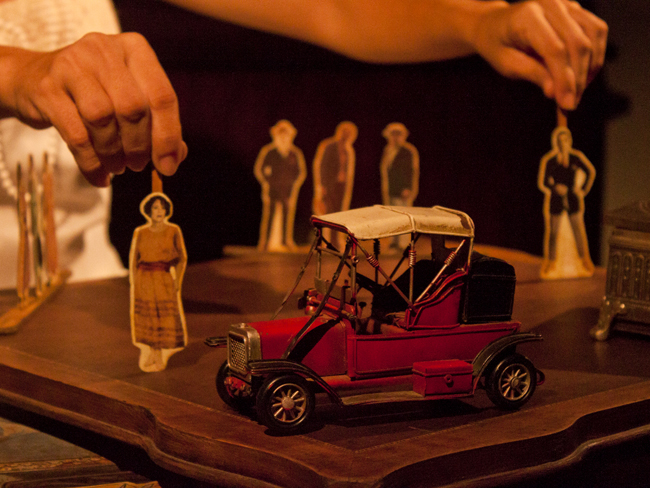 L’originalité de ce spectacle tient à la façon dont cette vie modeste est racontée. Les histoires de cette femme ne se racontent pas avec des mots, mais avec des images, des objets, des miniatures. Toute une dramaturgie de l’objet et du geste est conçue : les boîtes se découvrent à double-fond, les images se déplient, les cartes s’ouvrent, les coffres se retournent… La minutie précieuse avec laquelle chaque objet a été travaillé se révèle un art à part entière. Plus encore, le goût de collectionneur qui préside à la pratique se manifeste dans le fait les objets ne sont pas travestis, mais qu’ils sont au contraire déployés de telle sorte qu’ils découvrent leur charge d’âme.