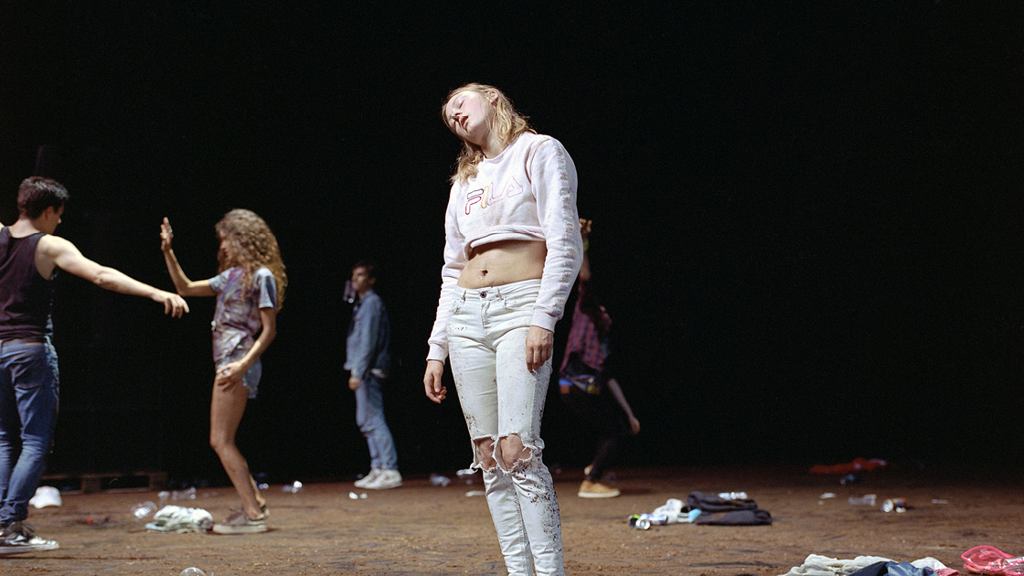 Alors que le plateau de la grande salle était recouvert de boue avec Macaigne, c’est ici une herbe piétinée et terreuse que l’on trouve dans la salle transformable. Parsemée de déchets, bouteilles en plastique écrasées ou canettes, cette pelouse évoque le décor désolé d’un après-festival de musique, qui vibre encore des sons et des corps qui ont dansé et bu. De premiers indices sont ainsi livrés, avant la longue mise en place de la nouvelle fête à venir. Gisèle Vienne travaille en effet dans cette œuvre sur la perception du temps, et c’est ainsi au ralenti qu’elle fait entrer ses danseurs, l’un après l’autre, tandis que retentit une musique rythmée.