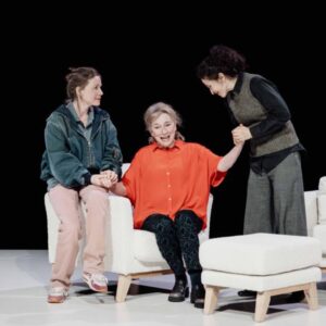 Quand les deux femmes commencent à parler, s’imposent moins des personnages, une situation, qu’une langue. Celle de Lygre, qui d’emblée, prend toute la place, et rend inutile les corps, les gestes et les regards, car elle comporte autant – si ce n’est plus – de didascalies internes que de paroles dites ou de pensées formulées. Cette exhaustivité rend le jeu guindé, maladroit. Mais la mise en place est peut-être nécessaire pour faire comprendre que, dans ce texte, le langage est un tissu sans nœud ni trou : les personnages parlent, racontent, se racontent, pensent, et le flux n’est troublé que par de multiples incises – « ai-je dit », « je pense », « il a répondu », « tu dis »… –, qui modifient constamment les coordonnées de l’énonciation et empêchent de savoir si l’on assiste à une situation au présent, une scène racontée a posteriori ou encore si les personnages ne se racontent pas la scène au moment où elle se passe, comme pour la mettre à distance afin de se protéger.