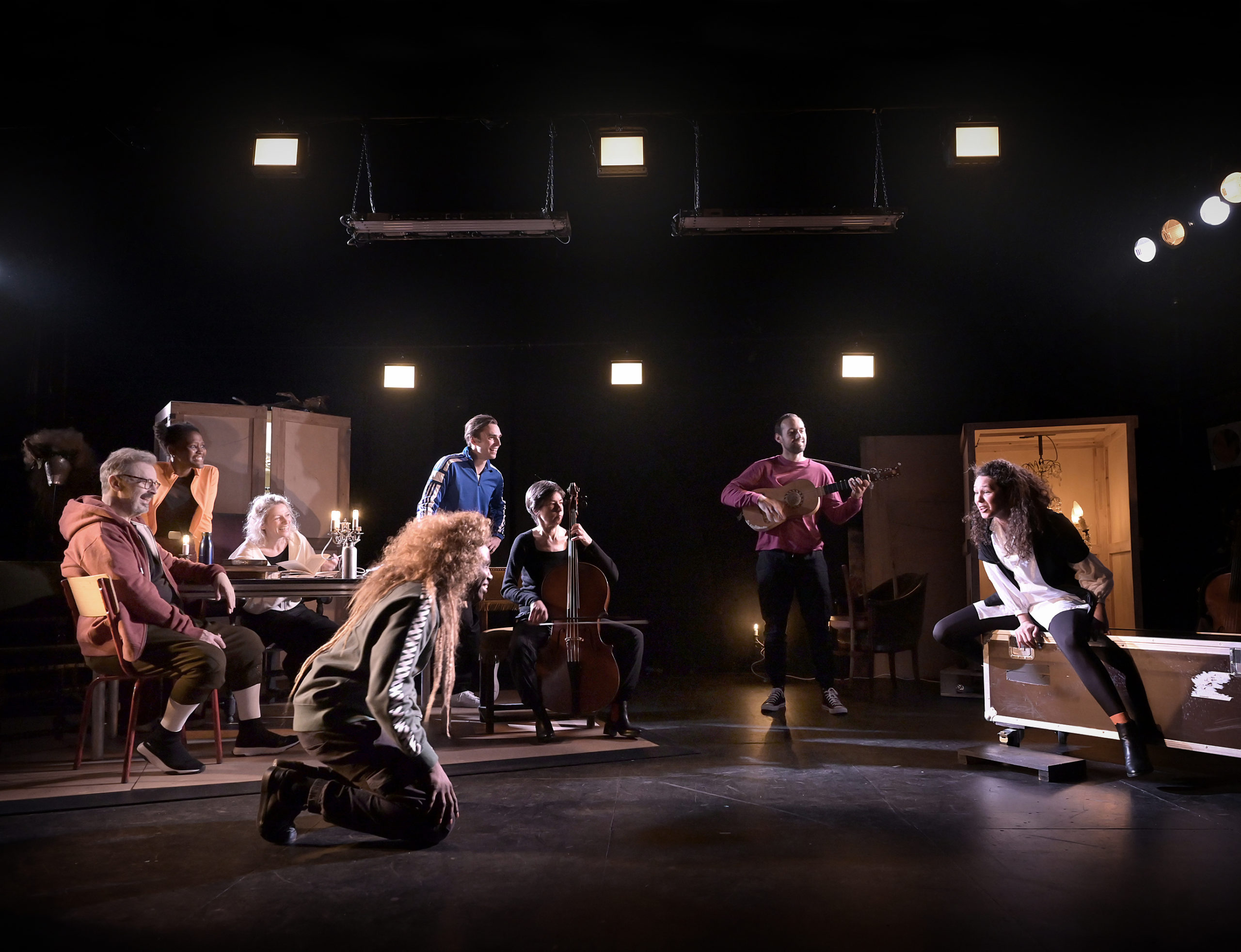 Ce procédé baroque qui mêle les époques et les identités permet surtout au metteur en scène d’en dire beaucoup tout en se passant d’un arsenal didactique. Tout ce que relate Agathe Sanjuan, conservatrice-archiviste de la Comédie-Française, au sujet des relations de Molière et Lully dans le programme de salle se retrouve dans le spectacle, sous une forme ludique jouée et chantée par six acteurs et deux musiciens qui jouent du théorbe, de la basse de violon ou de la guitare baroque. Une dramaturgie élégante est ainsi tissée, qui mêle données historiques, dialogues plus ou moins fantaisistes entre les deux artistes, chants baroques parfois adaptés par Vincent Leterme, et quelques réflexions fines sur la survivance de la musique et du théâtre au long des époques.