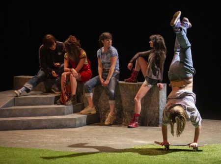 Une fausse pelouse d’herbe verte rappelle celle qu’avait utilisée le collectif Les Possédés pour son adaptation de Bullet Park, roman de John Cheever consacré aux suburbs américains des années 1960. Sur le plateau se trouvent également quelques marches, une pente et un muret à jardin, ainsi qu’un mur de pierre surmonté d’un grillage à cour. Une date, 1992, est projetée, puis sept acteurs arrivent avec des habits de rigueur : survêtements ambles et fluos, petits sacs à dos en cuir, chaussettes apparentes, baskets blanches. La parole circule entre eux d’un bout de phrase à l’autre pour raconter l’émergence d’un groupe qui dit à lui seul toute leur époque : Nirvana. Après cette introduction chorale, Smells Like Teen Spirit est diffusé à très haut volume, et tous écoutent le morceau en nous regardant. Quand ils se sont dispersés, n’en reste plus qu’un sur scène, Anthony, qui nous confie rêver d’avoir une moto un jour, et qui en attendant emprunte celle de son père sans sa permission pour partir en soirée.