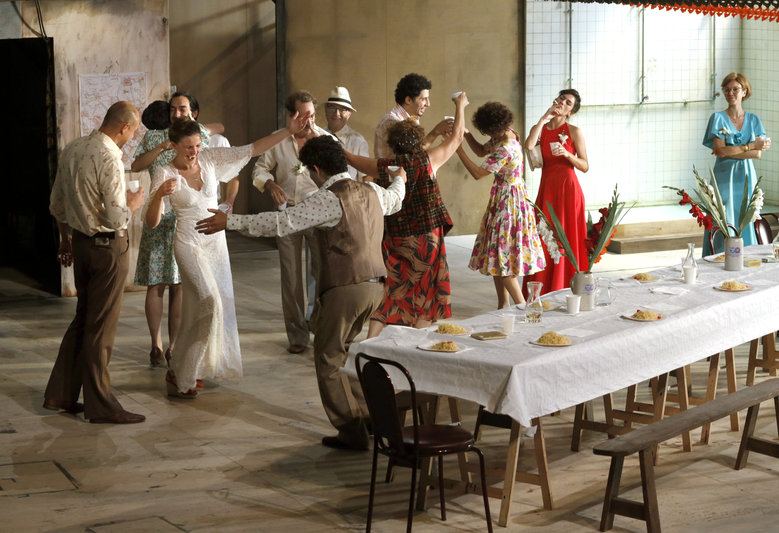 Après l’entracte, le spectacle reprend avec une nouvelle scène familiale, qui a pour prétexte le mariage de Marion et Jochen. La longue séquence ramène aux premières amours de Julie Deliquet. Les tensions se multiplient, l’alcool aidant ou y remédiant, on ne s’ennuie pas, mais on retrouve avec plaisir les problématiques des ouvriers à la fin du repas, quand ils délaissent la joie de la noce pour faire part de leurs préoccupations au sujet de la délocalisation de leur usine. Le happy ending que semblait constituer le mariage se trouve ainsi nuancé. Vient ensuite un dernier plan-séquence à l’usine, au cours duquel les ouvriers et ouvrières se trouvent confrontés à leurs propres idées, les points de négociation imaginés le jour de la noce ayant été en grande partie acceptés par la direction, notamment celui de leur autogestion. Les voilà à discuter de leur répartition du travail et des éventuels bonus qu’ils pourraient toucher. De nombreux débats affleurent, parfois écourtés par un vote. Ici éclate le caractère utopique et presque naïf du scénario de Fassbinder qui déclarait : « C’est presque un crime de représenter le monde tel qu’il est », et qui préférait, à 27 ans, opposer au monde tel qu’il était une version innervée d’idéal, représentant l’émancipation féminine et la révolte ouvrière comme des combats joyeux, capables de révéler solidarité et intelligence de groupe. Cet idéalisme qui correspond bien à l’art de Julie Deliquet, quoique séduisant, nous fait paraître à nous-mêmes un peu aigris…