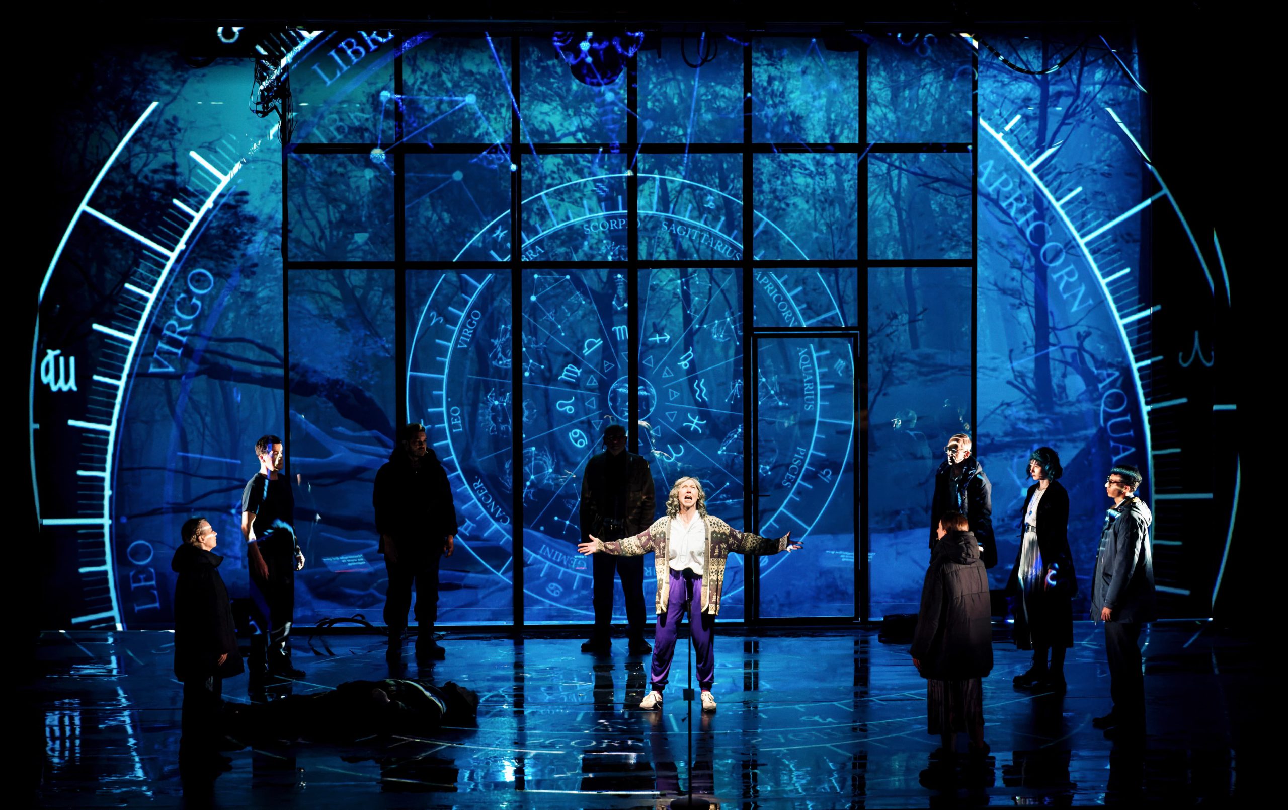 Retrouvailles avec Simon McBurney plus de dix ans après son mémorable Maître et Marguerite, présenté dans la Cour d’Honneur du Palais des Papes. Une continuité profonde lie ce spectacle au dernier en date, Drive Your Plow Over the Bones of the Dead : il s’agit une nouvelle fois de l’adaptation d’un roman – Sur les ossements des morts dans sa traduction française, écrit par l’autrice polonaise Olga Tokarczuk, Prix Nobel 2018 – qui a pour figure principale une femme. Après Marguerite donc, Janina. Ou plutôt Mme Doucheyko, car le personnage déteste son prénom. Ce n’est cette fois pas la magie de Woland qui inspire le metteur en scène britannique, mais, de manière plus diffuse, une perception ésotérique du monde, qui relie les astres à la nature, les animaux aux hommes, le petit au grand. Avec ce spectacle, la compagnie Complicité nous embarque dans une grande fresque narrative aux accents écologiques, grâce à un langage aussi précis que sophistiqué et un jeu d’acteur fascinant.