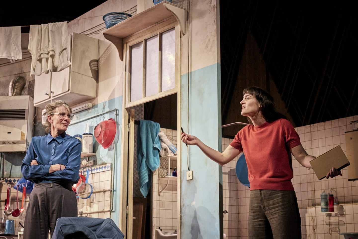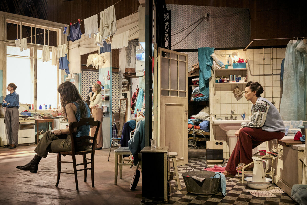 La scène de la grande salle Delphine Seyrig est habitée d’un ample décor extrêmement détaillé, qui représente un intérieur composé d’une chambre d’un côté, une salle de bain de l’autre, une pièce à vivre au centre structurée par du mobilier de cuisine, et au loin, une entrée dans laquelle se trouve un piano et une ouverture sur une autre chambre. L’espace est encombré de meubles, accessoires et objets accumulés, superposés, entassés. L’impression presque naturaliste que produit cet amoncellement est cependant faussée par le camaïeu trop exact de bleus et de rouges. Ces deux teintes sont en effet soigneusement déclinées, de murs et faïences jusqu’aux casseroles, passoires, draps et linge qui sèche en travers de la pièce principale.