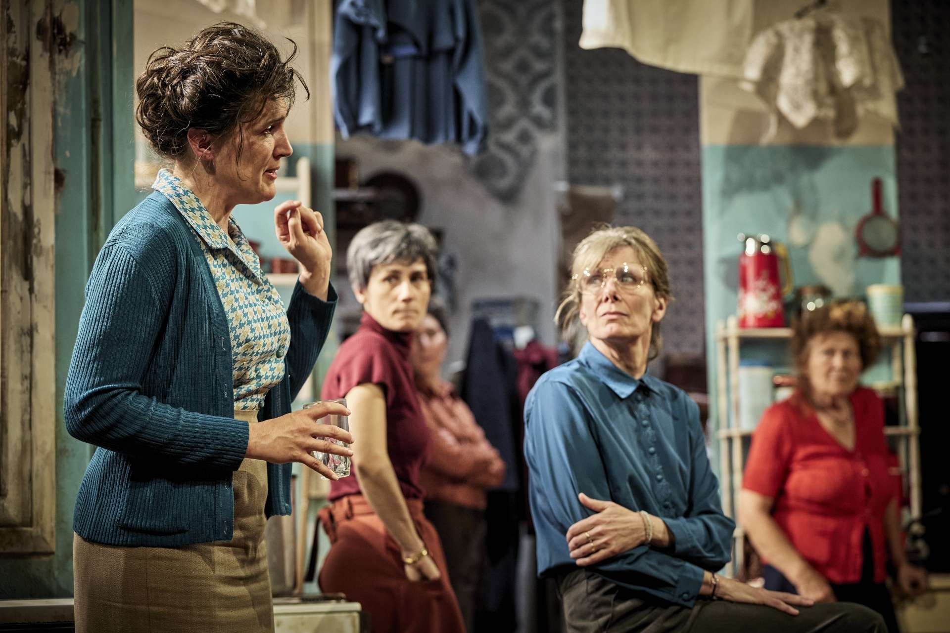 Ce parti pris artistique aussi passionnant qu’exigeant, on le devine dans les moments d’ébullition, quand une question ou un récit suscite des réactions contraires, ou dans leur écoute très attentive quand l’une parle. On retrouve là l’expérience de Deliquet avec son collectif In Vitro, sa capacité à reconstituer sur scène le brouhaha des conversations de groupe quotidiennes au centre de ses premiers spectacles. On devine aussi cette particularité du spectacle dans la surabondance de « ça, ça, oui c’est exactement ça », qui sert de manière presque systématique de transition entre deux témoignages, qui permet de l’emporter sur les tentatives des autres de prendre la parole. À l’inverse, les silences qui ponctuent parfois certains témoignages retentissent avec beaucoup de force dans cette explosion permanente de la parole. L’étrange de cette direction d’actrice est en revanche l’absence totale d’interaction entre les corps. Les femmes restent constamment à distance les unes des autres, elles partagent au mieux une cigarette mais n’entrent jamais en interaction, même quand l’émotion submerge l’une d’elle. C’en est presque gênant quand Marie Payen, qui incarne une résistante, s’effondre à la fin du spectacle.