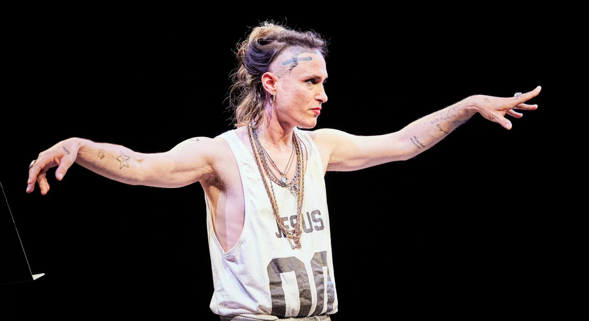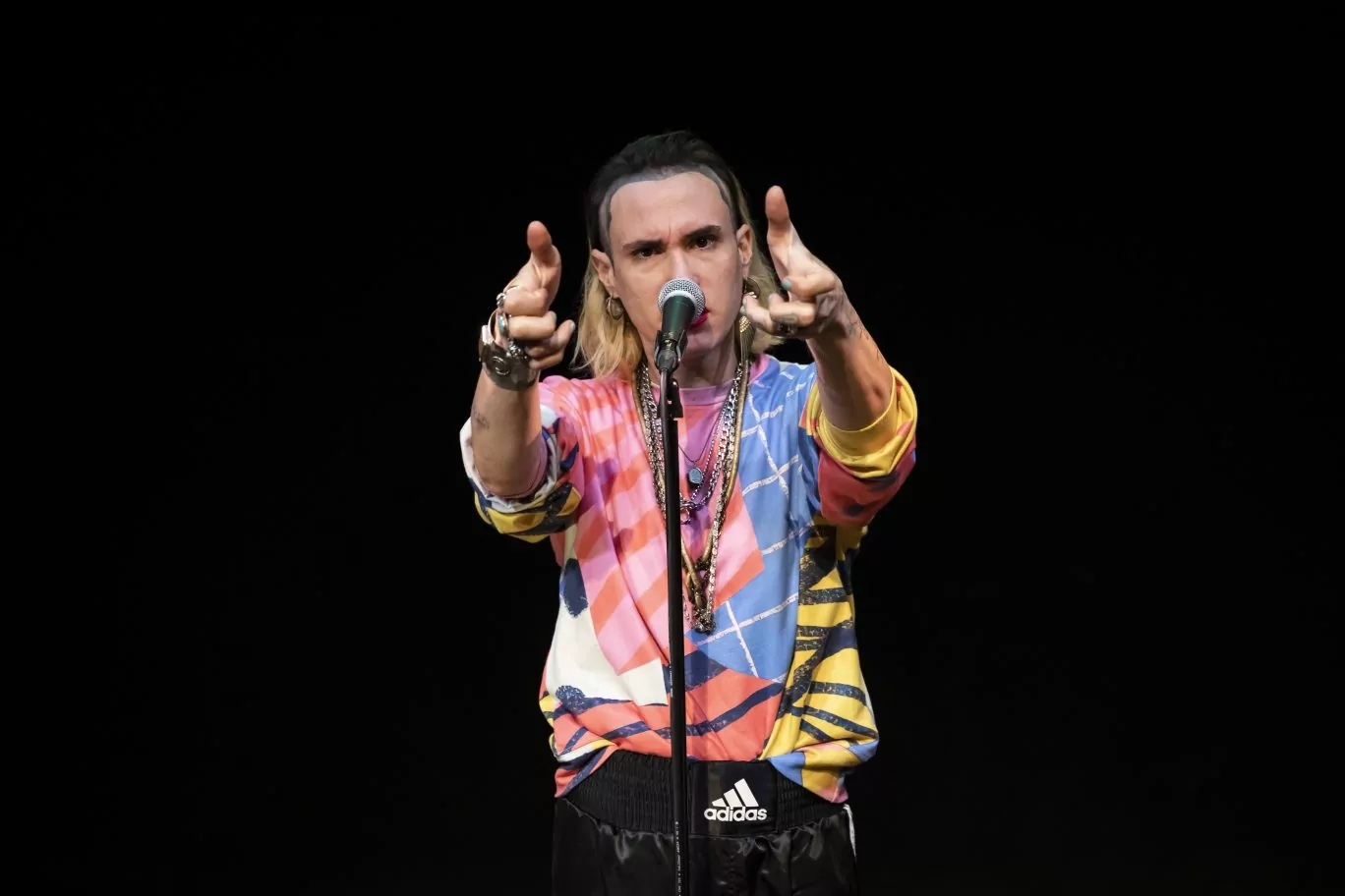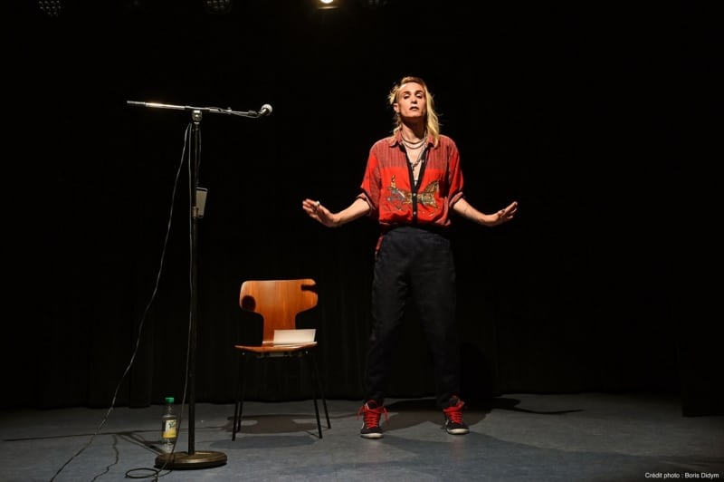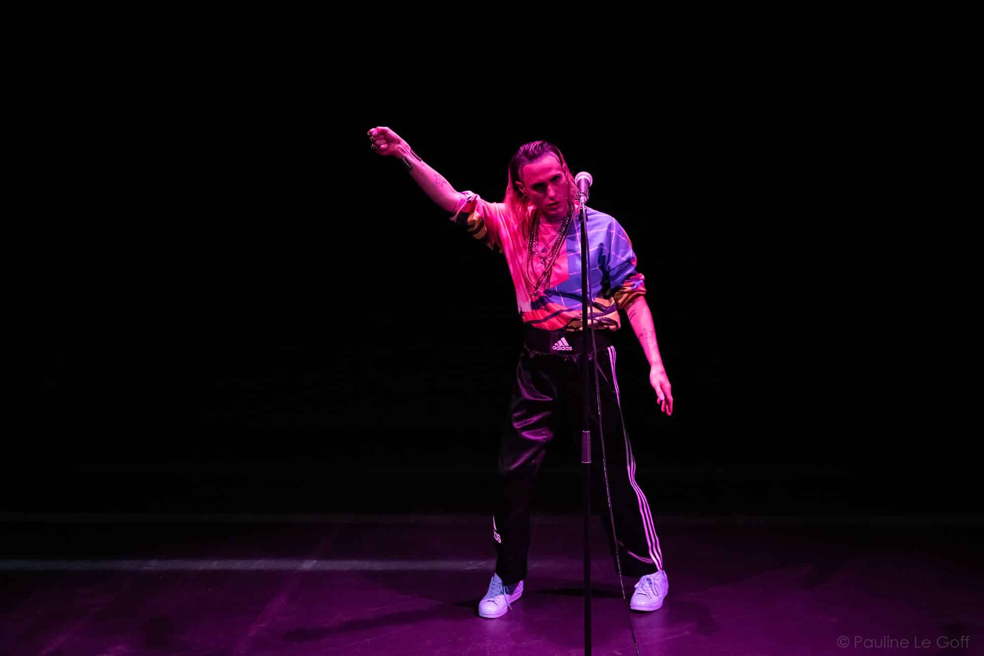 À d’autres moments sa joie, son plaisir, ses rires éclatent puissamment quand elle improvise, quand elle s’offre le temps de jouer avec les réactions de la salle, quand elle se laisse entraîner par ses propres blagues. Le contraste est alors spectaculaire avec la gravité, la noirceur, la violence de ce qu’elle raconte par ailleurs, et avec la souffrance qu’expriment son corps et ses traits. Tout à coup, son visage s’illumine, il devient autre – de manière encore plus nette que lorsqu’elle décrit l’opération de féminisation qu’il a subi, ou qu’elle joue avec l’étendue de sa tessiture de voix, de la plus grave à la plus aiguë, ou qu’elle met de côté les gestes de bonhomme pour embrasser les postures de femme (l’inclinaison du poignet pas trop gay, l’angle de 26 degrés du cou et du menton, les joues rentrées et les lèvres qui pointent). Ces métamorphoses d’humeur en direct rendent encore plus attentif à sa présence face à nous, à son corps, que l’on détaille très précisément (ses cheveux, ses tatouages, ses muscles, ses mains, ses bijoux, ses vêtements) en s’interrogeant sur notre regard, sur nos critères normatifs face à des identités queer – mais aussi face à des comportements neuroatypiques.