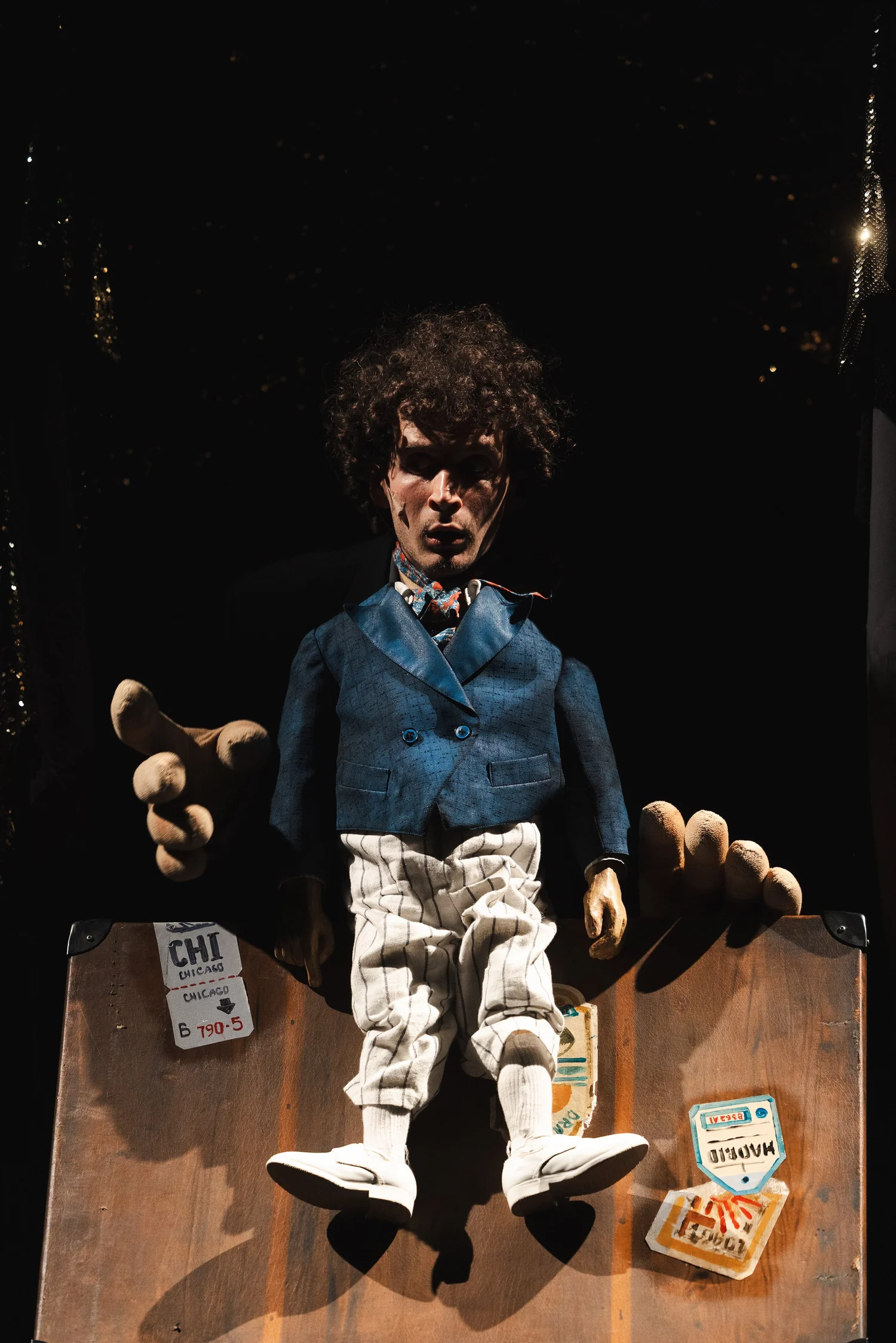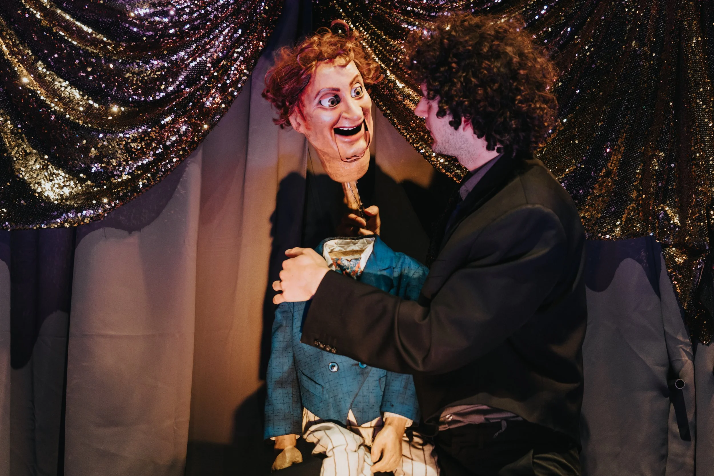 En attendant que le public s’installe, un chat rôde au-dessus des trois panneaux décorés d’un tissu à sequins dorés qui structurent l’espace scénique. Sa présence et ses mouvements évoquent le chat du Cheshire d’Alice au pays des merveilles, souvenir encore plus prégnant quand il brandit une pancarte « Applaudissez » en guise d’ouverture du spectacle et que l’on s’exécute. Entrent alors Pedro Hermelin Vélez et sa marionnette Terri, nom choisi en hommage à la ventriloque Terri Rogers comme le dénonce assez vite la marionnette elle-même, qui accuse son manipulateur de plagiat.